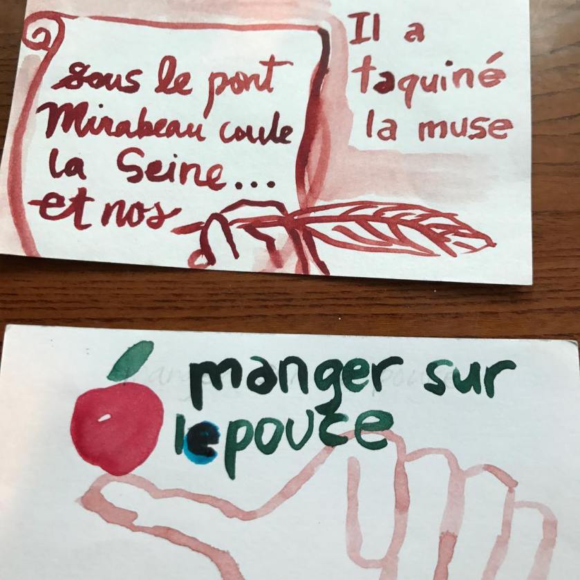 When I acquired 2000 index cards, my friends asked what they were for. Lots of things, but here I am using them for watercolored mnemonics for French phrases. Having conceded that Finnish is unmasterable, not only because of its grammatical complexity but because an English speaker in Helsinki never has a chance to speak it, I reconceived of myself not as a failed Finn, but as a potential European and decided I would master at least one European language. I was closer in French than Spanish so I’ve been working at it. Easy language, and solid literature too! To study languages I recommend two books, The Practice of Practice, which is about learning music, but is applicable to any learned skill, and Fluent Forever, which. It was from the latter book I derived this flash card method.