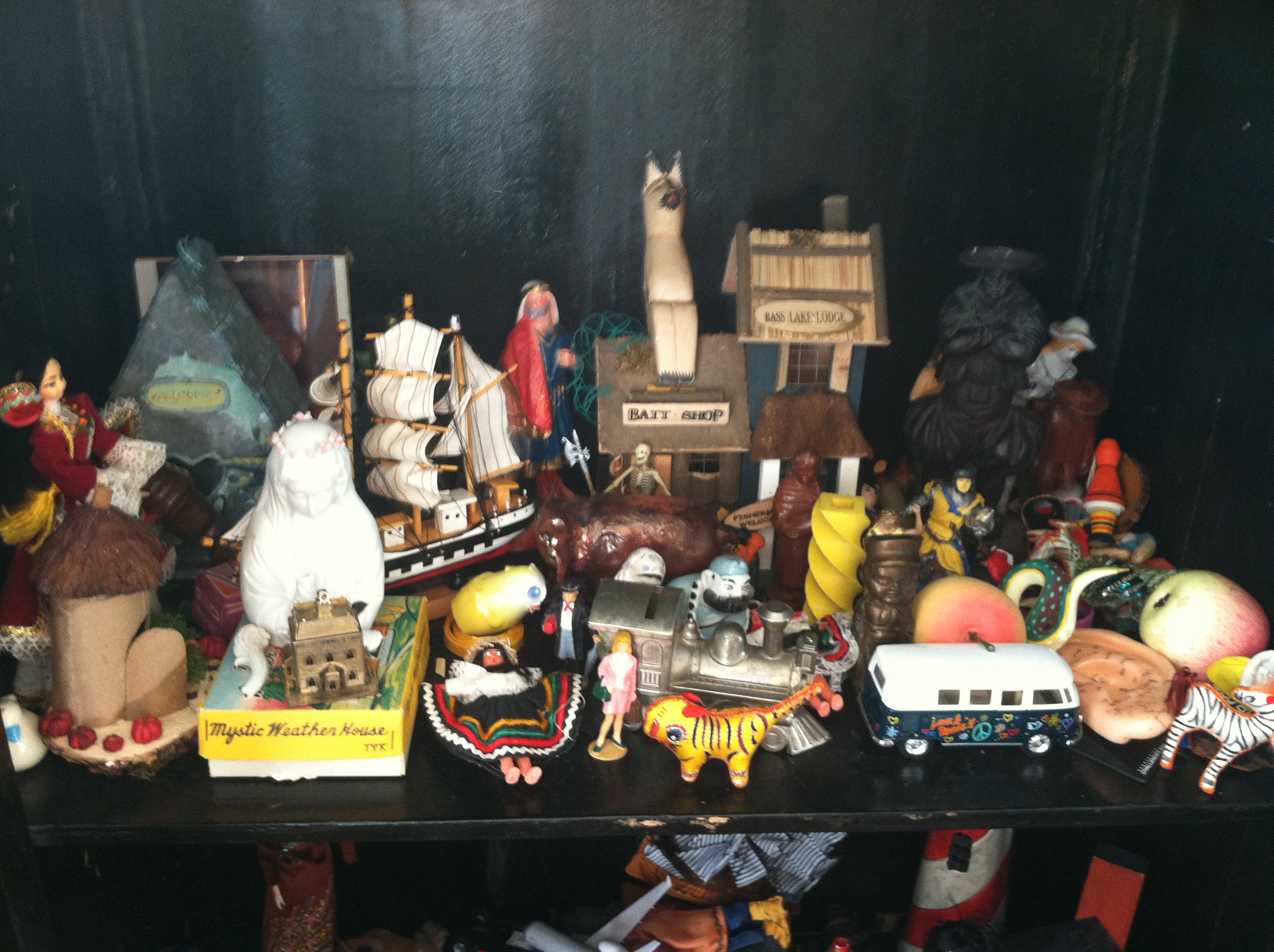 In my house there is an old Chinese cabinet, full of little figurines on two shelves. They are for my daughter, to tell stories. We have told hours and hours or stories using these figures. There are all kinds of people, children and adults, and all kinds of animals — elephants, tigers, snakes. There are trees and cars and boats. There is an airplane. An angel, a devil, a vicious dog, a knight. They were mostly acquired at flea markets and yard sales.